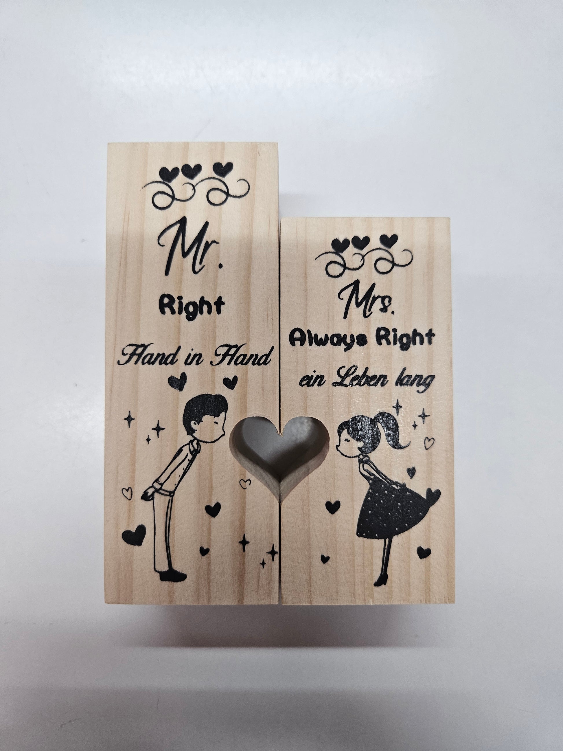 - Romantische Botschaften: „Mr. Right“, „Mrs. Always Right“, „Hand in Hand“ & „ein Leben lang“